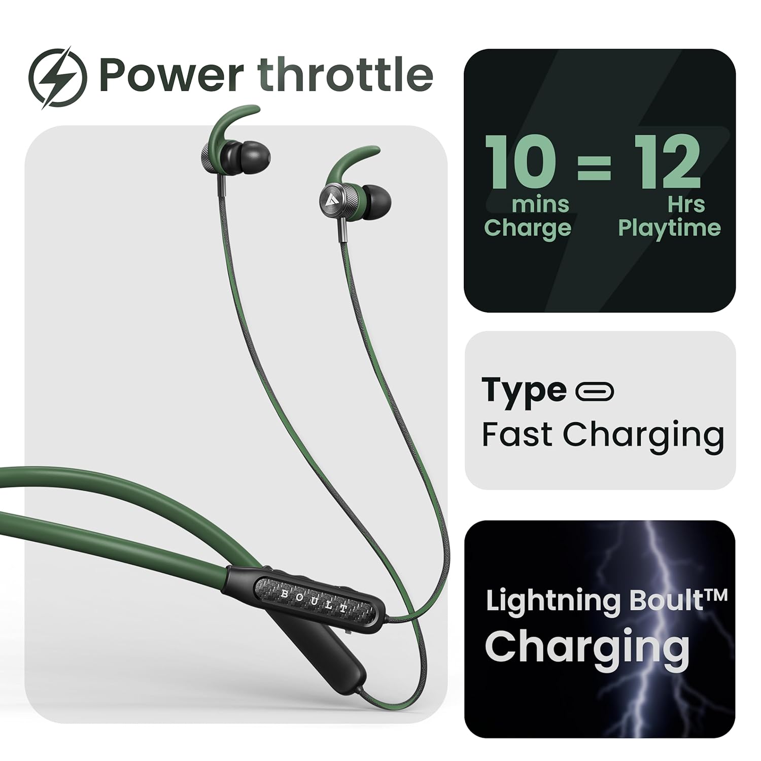 - 10 mins charge = 12Hrs playtime. Lightning Boult Type-C fast charging makes this possible, getting your neckband ready in no time.