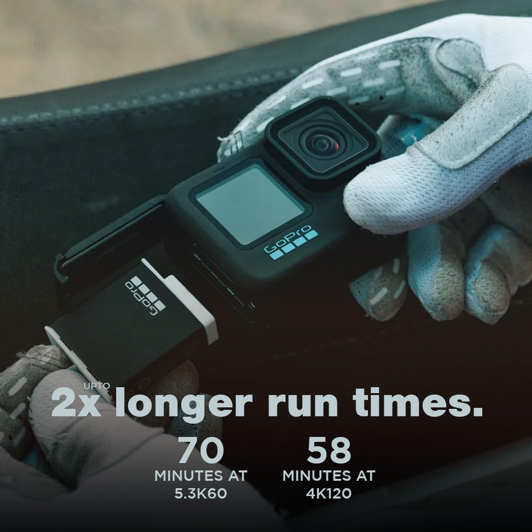 - 2x Longer Runtime¹ : HERO12 Black’s dramatically improved battery efficiency combines with the included 1720mAh Enduro battery to deliver a huge 2x increase in 5.3K60 video runtime on each charge. You’ll get 70 minutes of continuous recording at 5.3K60 (our highest setting), plus over 1.5 hours at 5.3K30 and over 2.5 hours of continuous recording at 1080p30.6 Using advanced technology, Enduro also boosts performance in cold temperatures over previous GoPro cameras and batteries