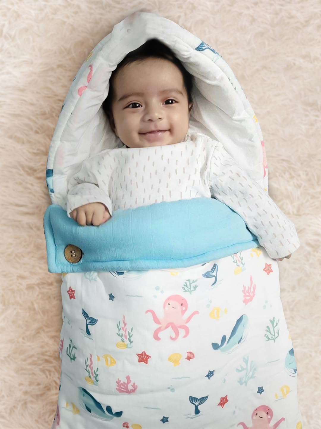 SOFT FABRIC: Our baby sleeping bag carrier nests are made of a soft muslin outer layer with a polyfibre filling providing utmost comfort on the go. The breathability of the muslin layer ensures that there’s enough air flow and the baby’s body temperature is maintained at all times.