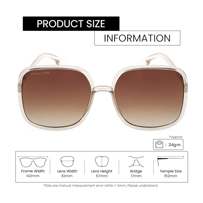 PRODUCT DIMENSION –Size (Large)- Lens Width: 60mm(2.36inches) | Lens Hight: 60mm(2.36inches) | Nose Bridge: 17mm(0.66inches) | Temple Length: 145mm(5.70inches)