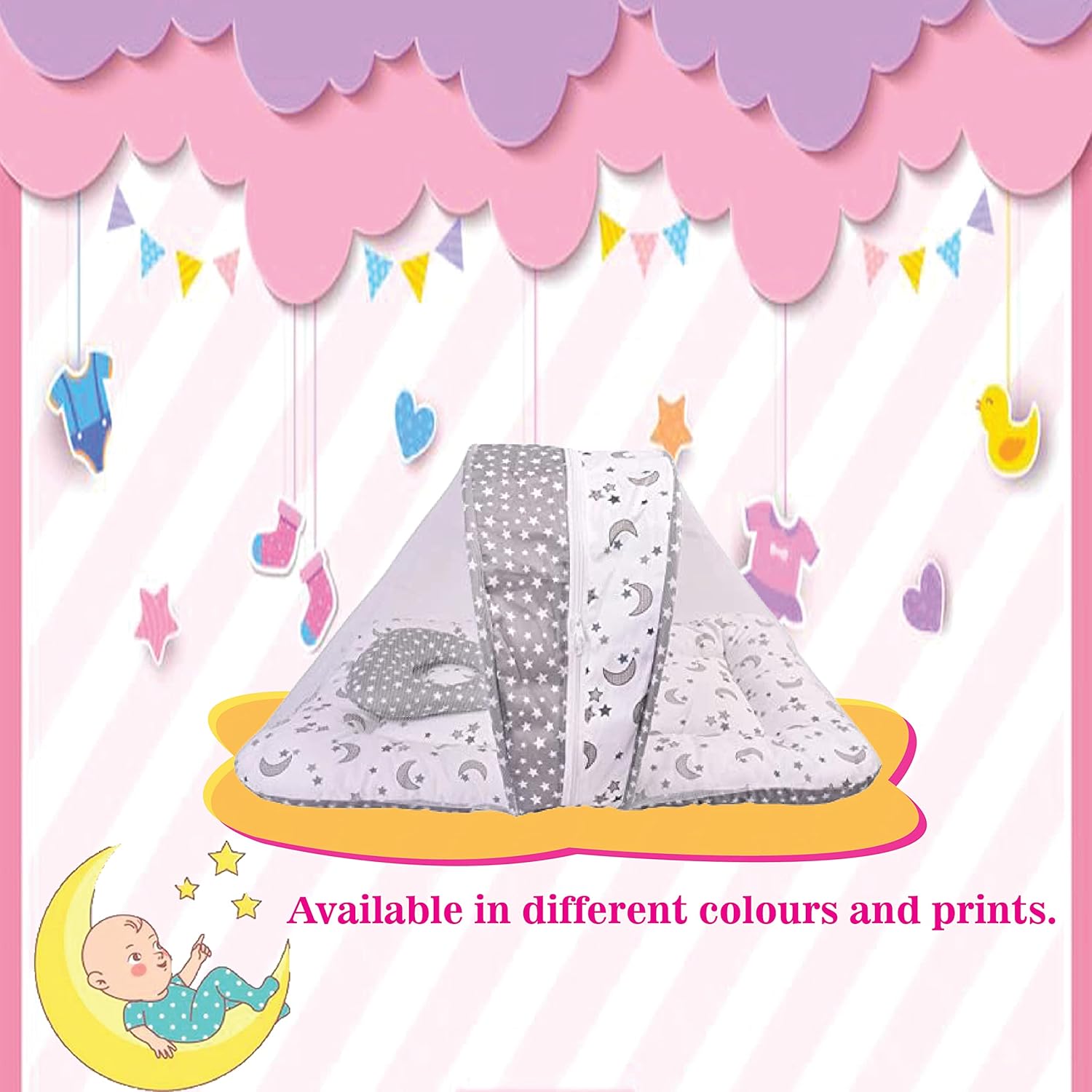 This new born baby bed mattress with net, supported with cotton outside and inner filling with recon gives a soft and comfortable zone to your little one. Baby bed; baby bedding set; baby sleeping bags; toddler bedding set; cot bedding sets; mosquito net; sleeping bag; baby products; new born baby; mattress; cot bedding sets; newborn baby products all; baby beds; mosquito net for baby; baby mattress.