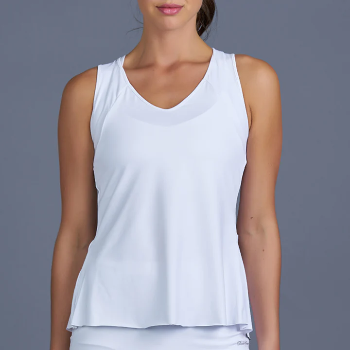 Tank Top - printed shoulder inserts, subtle v-neck, back yoke cut accenting the waistline and a modern raw hem finish.