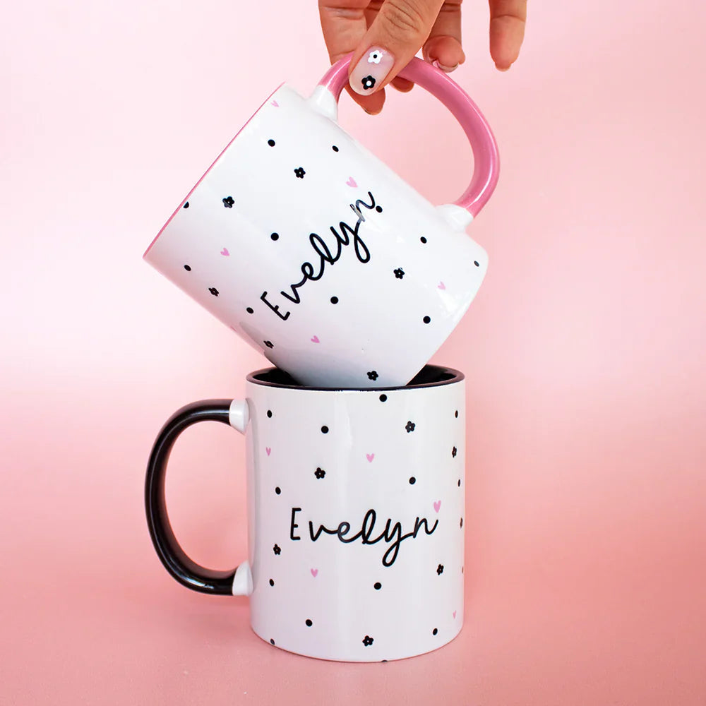 We can now add this to your TreatBox we will print the recipient's name and add it to the gift box. Personalised with your choice of a name, this fabulous mug is the perfect thoughtful gift. Featuring polka dots and flowers, with a Black or Pink inside and handle.