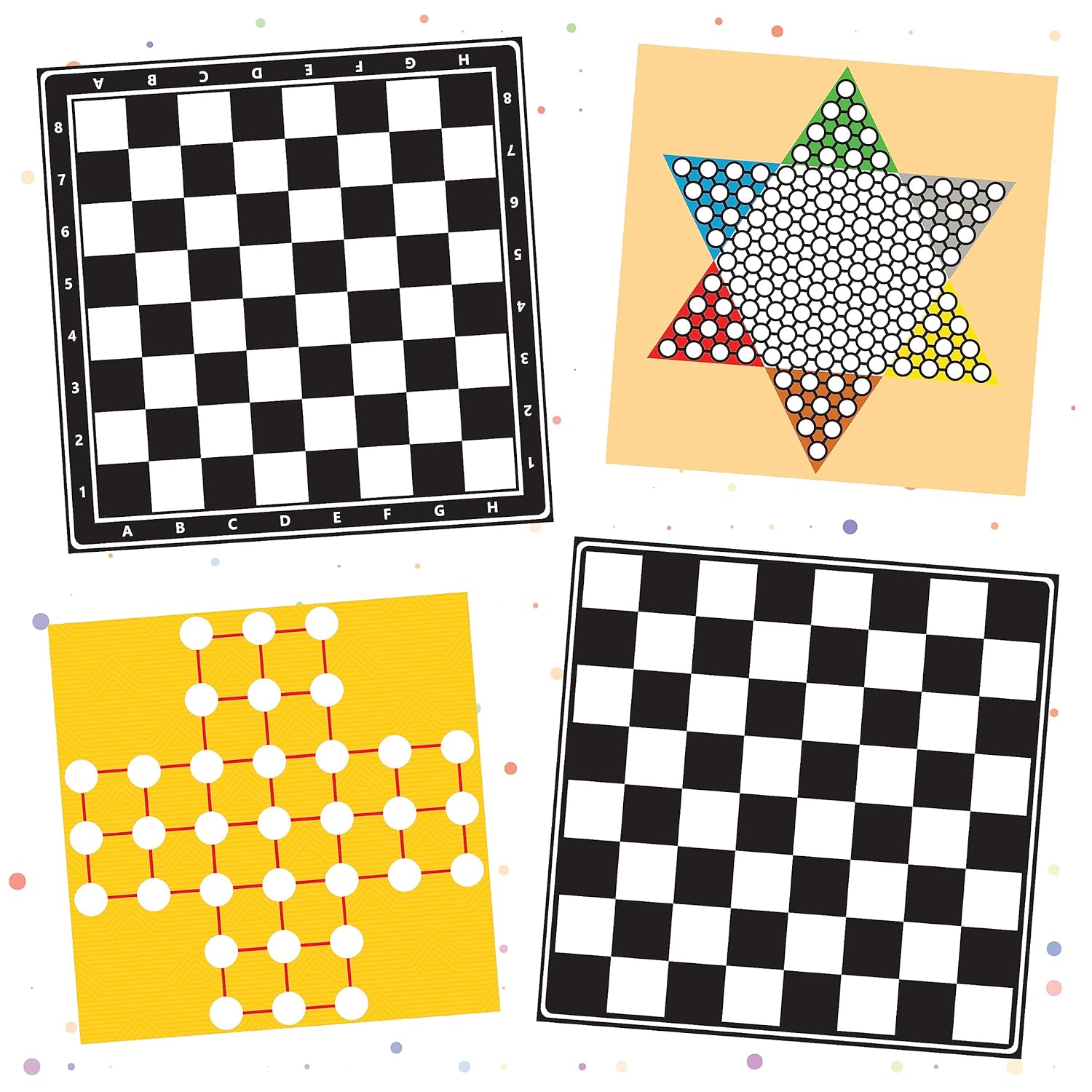 - 5. Comprehensive set includes a game board, five double sided sets of game,16 pawns, chess pawns, checker pawns, 1 dice and 1 instruction manual.